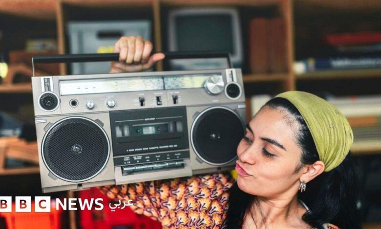 صورة لشابة تبدو سعيدة وهي تحمل على كتفها جهاز مسجل الكاسيت