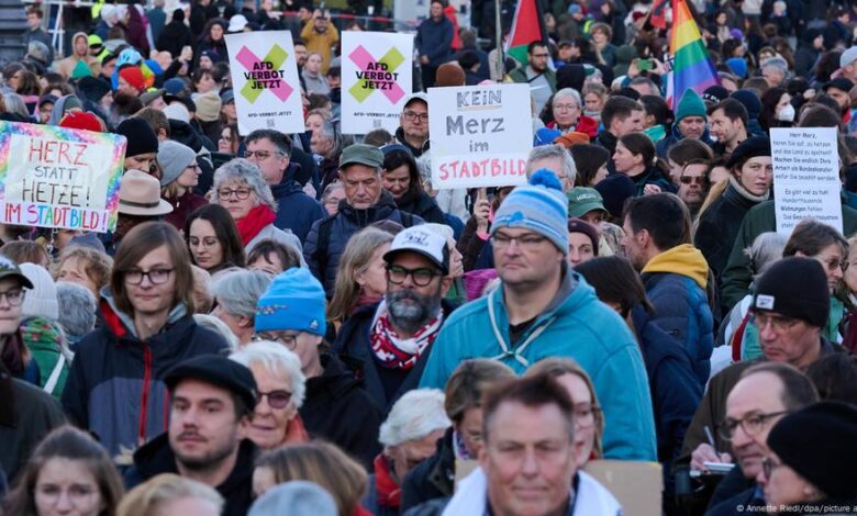 وشهدت العاصمة الألمانية برلين مظاهرة حاشدة مساء أمس الثلاثاء أمام مقر الحزب المسيحي الديمقراطي، نظمتها حركة “معاً ضد اليمين” تحت شعار “تجمع نسوي: نحن البنات”. ووفقاً لشرطة برلين، شارك نحو 2000 شخص، بينما قدر المنظمون العدد بـ7500 شخص. ورفعت لافتات تحمل شعارات مثل “العنصرية مشكلة في المشهد العام للمدن” و”نحن المشهد العام للمدن”.